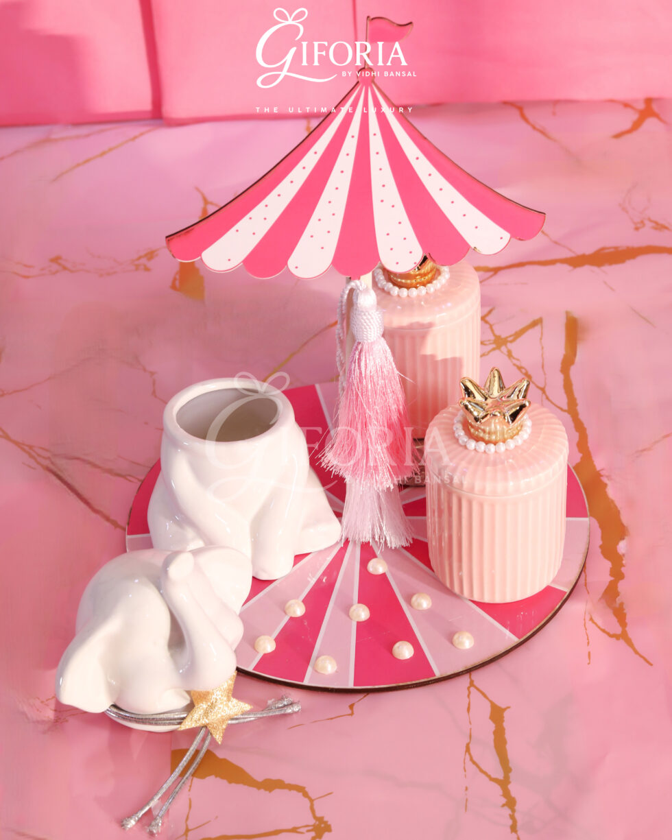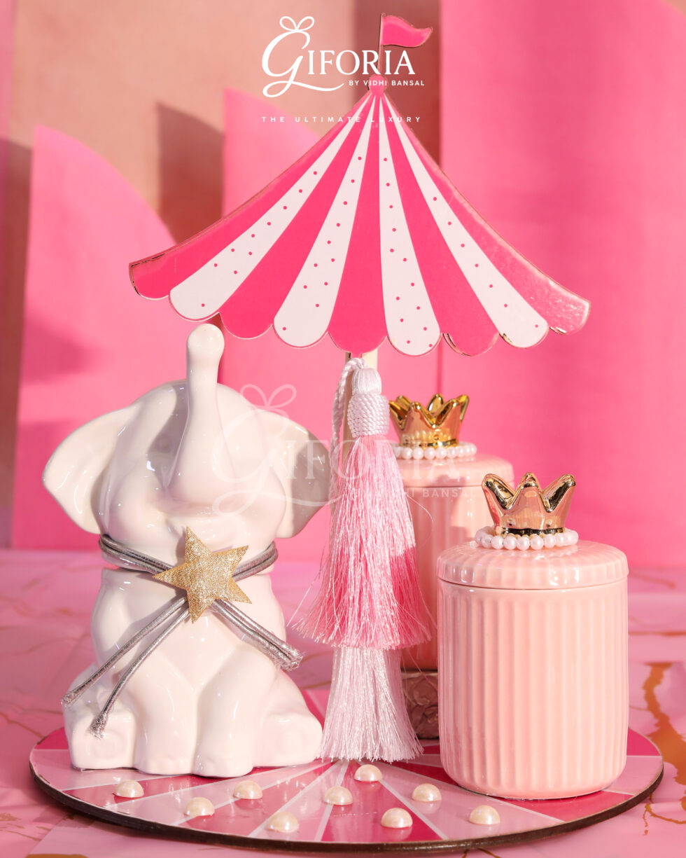 Step into a world of charm and royalty with our Royal Pink Elephant Luxury Gift Set, a signature curation by Giforia – The Ultimate Luxury. Designed with an enchanting carousel theme, this set features a beautifully crafted white ceramic elephant, adorned with a silver star ribbon, symbolizing joy, luck, and celebration.
