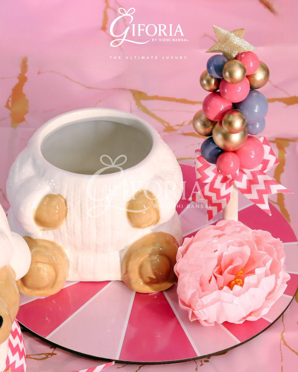 Perfect for birthdays, baby showers, festive gifting, or holiday hampers, this set brings together practicality and cuteness in one luxurious package. The beautifully coordinated accessories β€” including a pink flower accent, candy-style dΓ©cor tree, and premium ribbon detailing β€” make this gift photo-ready and instantly joyful.