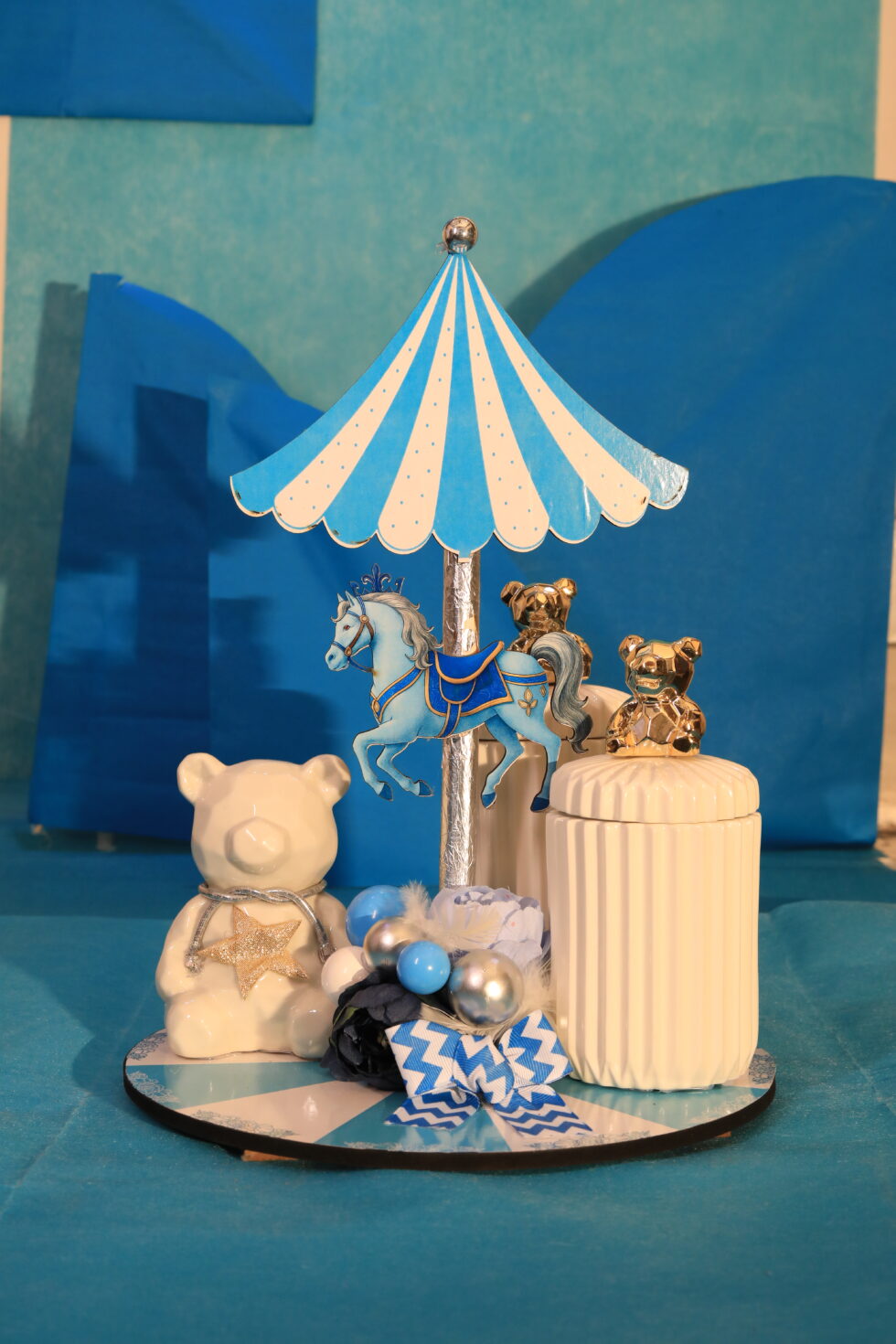 Includes: Carousel topper • Bear figurine • Luxury jar • Decorative base & floral-balloon accents