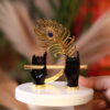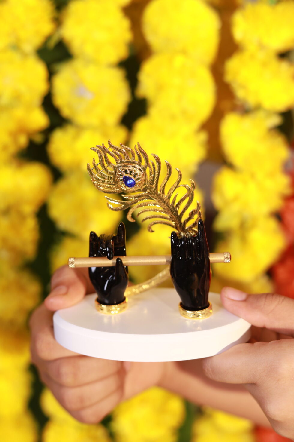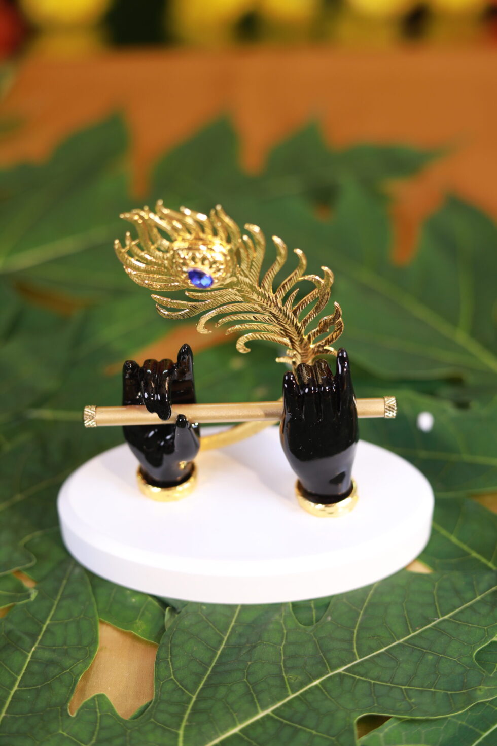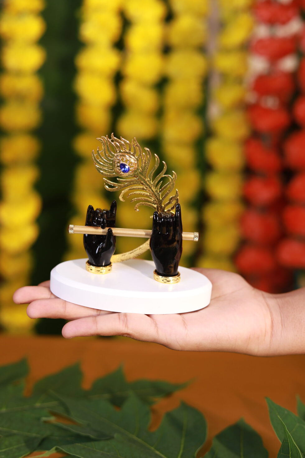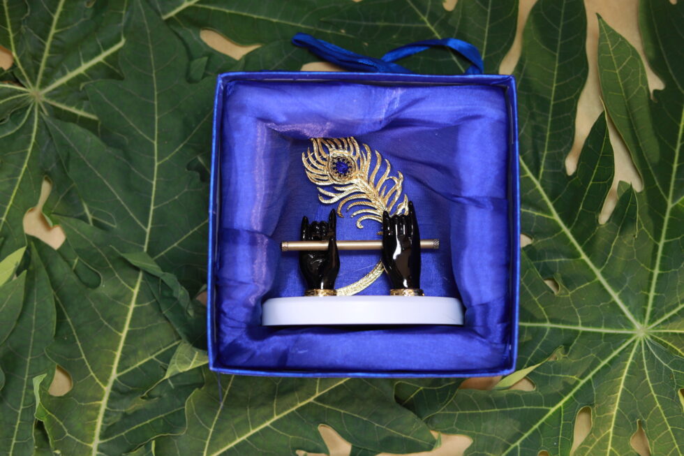 Add a touch of divine charm to your home or office with this Krishna Flute Holder featuring beautifully sculpted black hands holding a golden flute, adorned with a stunning golden peacock feather. Presented in a royal blue velvet box, this piece radiates elegance and spiritual serenity. Perfect as a gift for housewarmings, festive occasions, or spiritual décor, it symbolizes harmony, art, and devotion inspired by Lord Krishna.