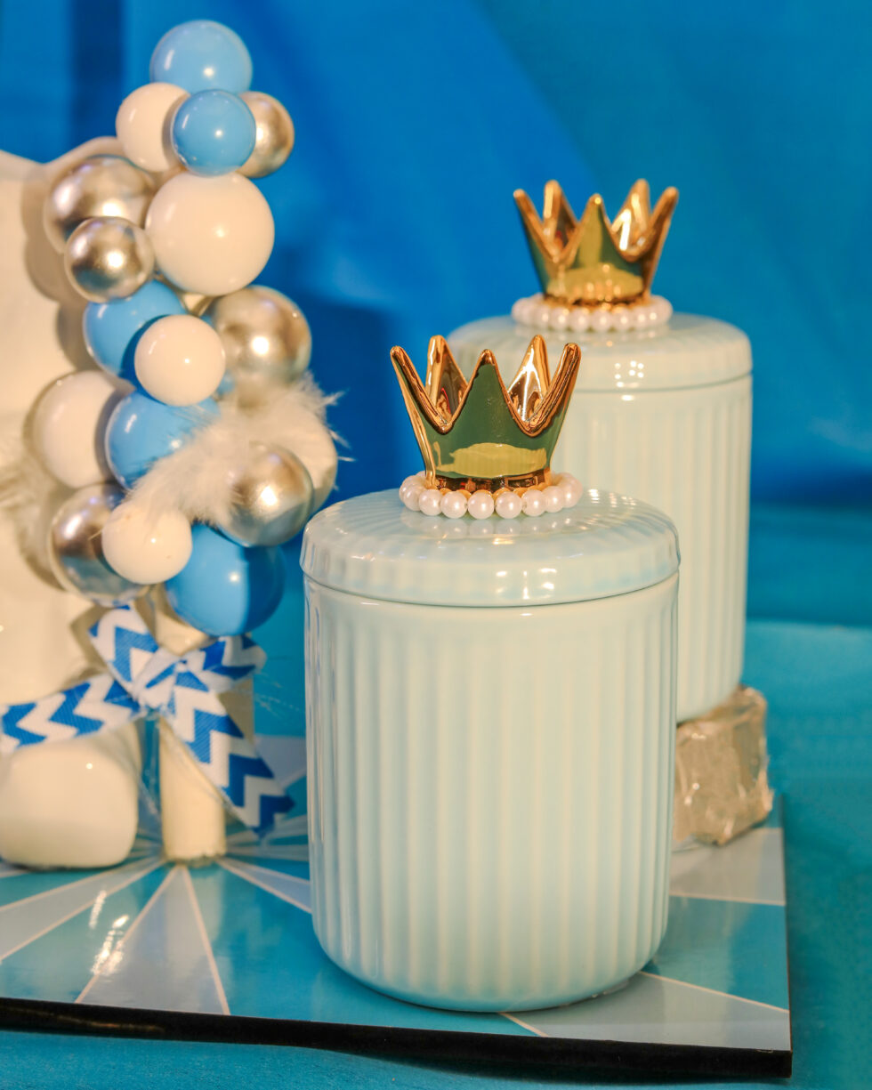 Stunning ribbed jars in soft baby blue topped with golden royal crowns embellished with pearlsβperfect for sweets, chocolates, dry fruits, or keepsakes.