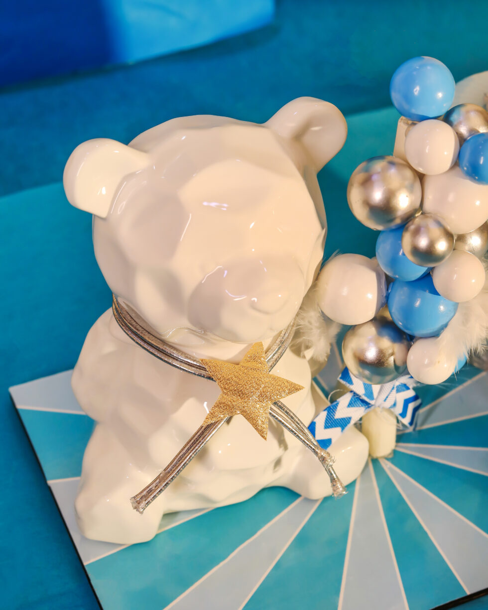 A modern, glossy bear adorned with a golden star ribbonβsymbolizing love, protection, and blessings for the baby.