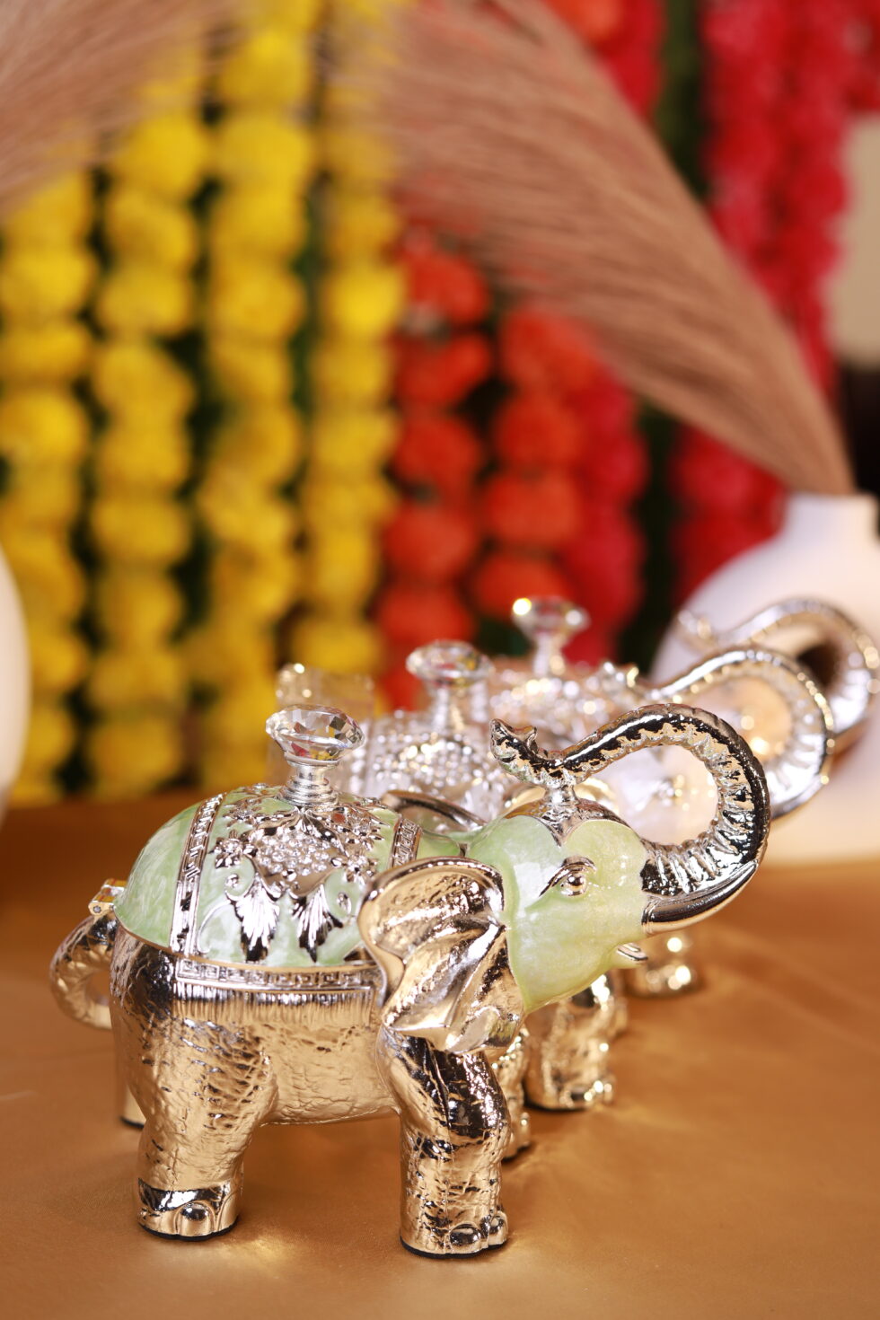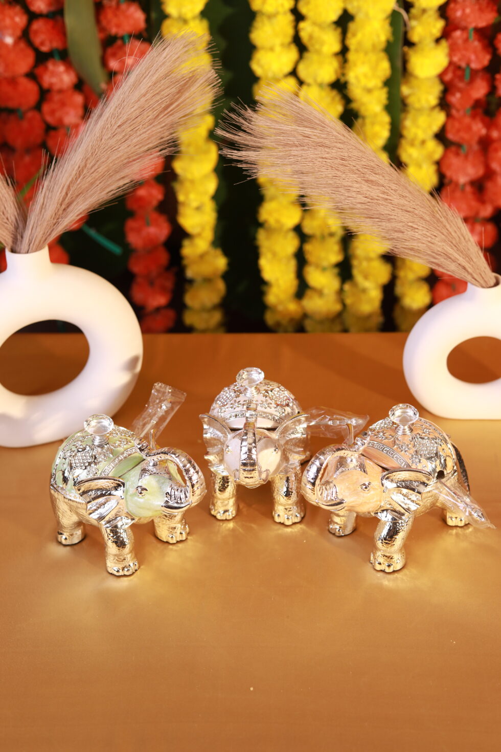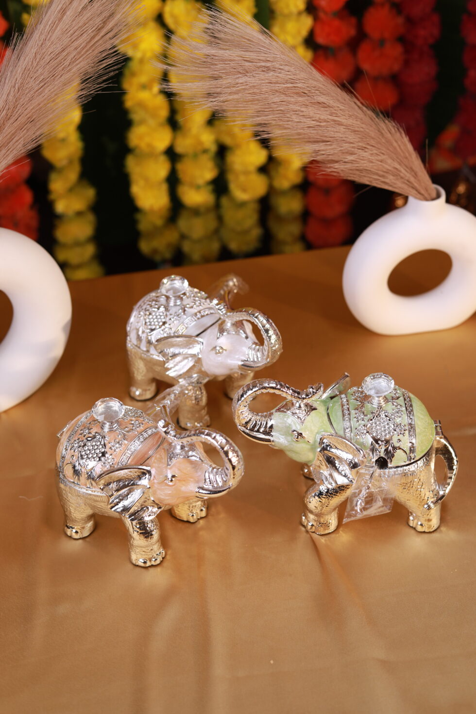 Each jar is beautifully designed in the shape of a decorative elephant, symbolizing prosperity, strength, and good fortune. The intricate engravings, paired with subtle meenakari hues, make them the star of any festive setup.