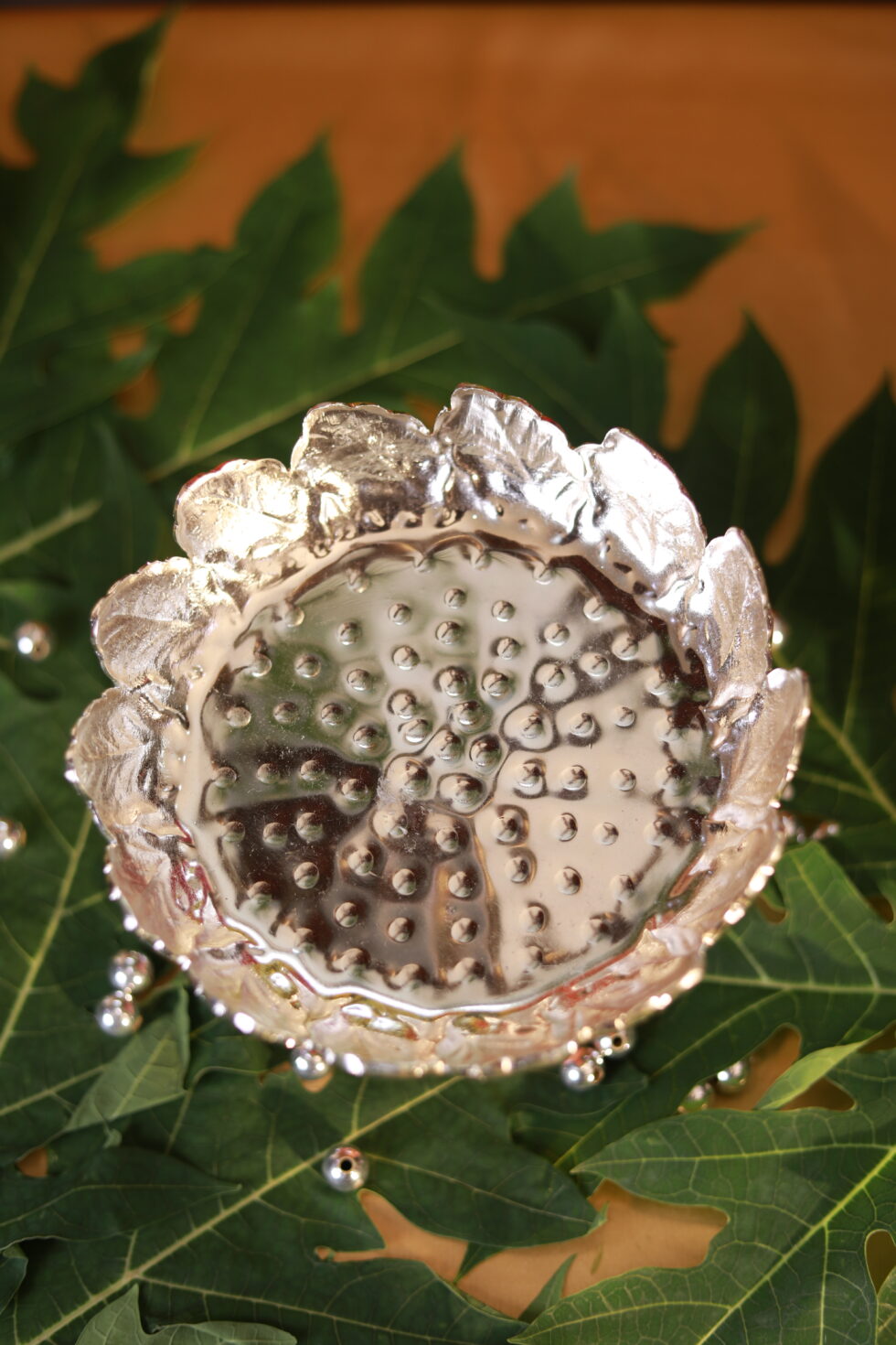 A stunning lotus-leaf inspired bowl with intricate carvings, perfect for holding fruits, prasad, dry fruits, sweets, or festive offerings.